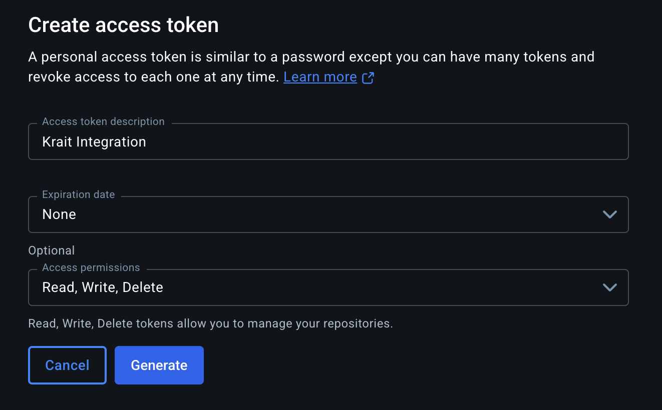 From Settings, go to Personal Access Tokens. Click Generate new token, provide a clear label such as Krait Integration, and add Read, Write, Delete access permission.